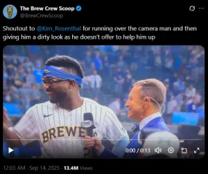 The Milwaukee Brewers celebrated a win this past weekend where attention from fans was drawn to a collision between a reporter and a cameraman in post-game festivities.