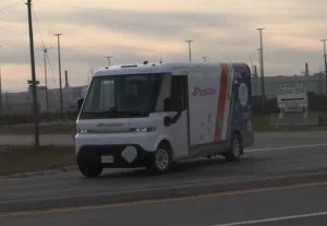 A BrightDrop electric delivery van exiting the CAMI assembly plant Nov. 19, 2025. (Hayden King/XFM News)